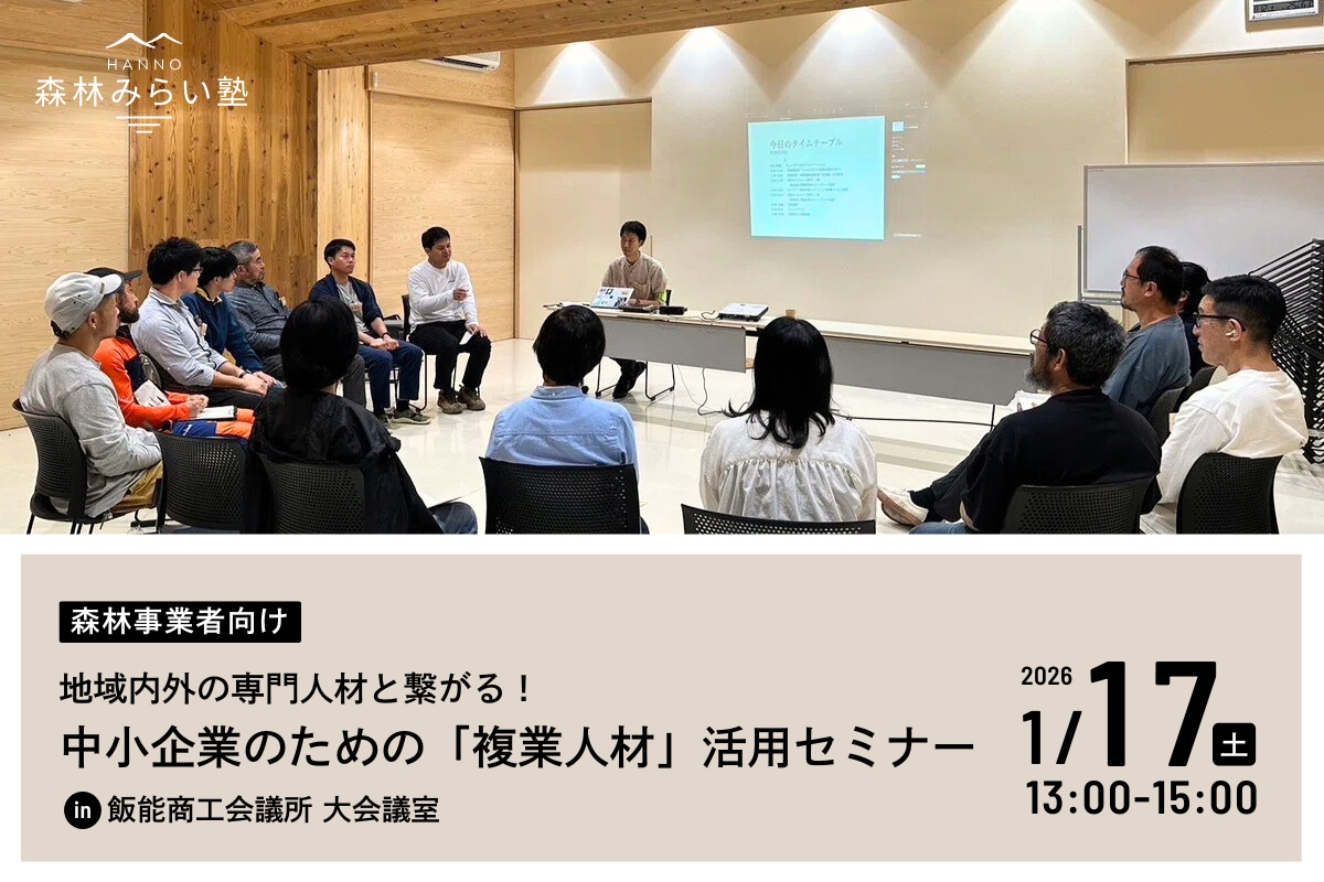 今年度の「はんのう森林みらい塾」では「森林複業の入り口をつくる塾」をコンセプトに、多様な職業を持つ受講生を対象に、飯能市内のフィールドワークを実施しています。全4回の講座の最終日午後を、公開セミナーとし、中小企業と複業人材が連携する実践的なノウハウの提供と、マッチングを目的とした会を開催いたします。